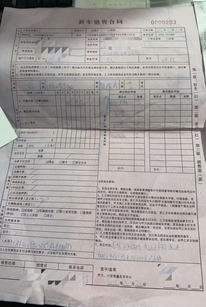 除臆造“国补”外,部分车主还发现,4S店归档契约与车主手执契约内容不一致,部分车主首付金额由1.2万元改为930元,还有部分车主实质支付的3万元、2万元首付款被鼎新为零首付,同期契约上客户署名一栏也非本东说念主署名。