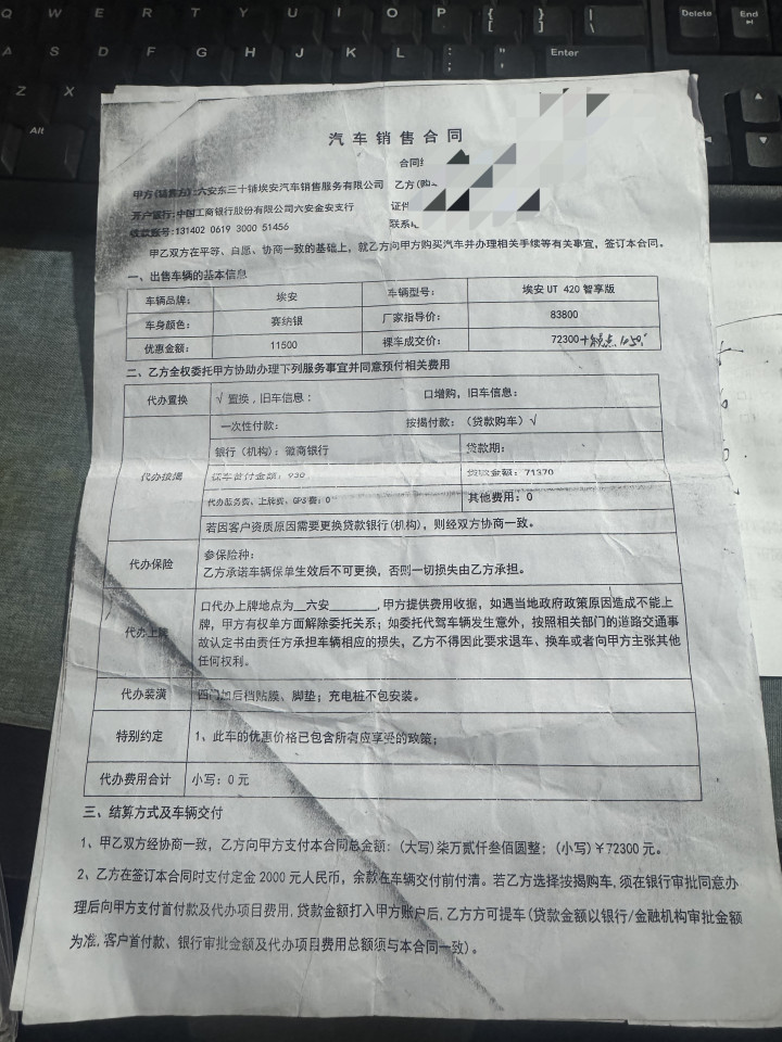 而把柄东三十铺埃安4S店提供的契约,首付金额的1.2万元被改为了930元,同期,客户署名也非他本东说念主所签。若首付金额“缩水”,这就意味着赵骏贷款金额也将增多。