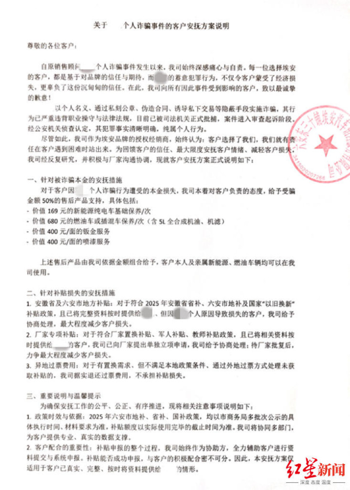 3月5日下昼,六安市金安区商务局在维权群内公布东三十铺埃安4S店《对于张浩个东说念主讹诈事件的客户安抚决议阐述》(以下简称“《安抚决议》”)。把柄《安抚决议》,东三十铺埃安4S店指出,经公安机关窥探认定,张浩犯警事实流露明确,熟谙个东说念主活动。行动埃安品牌的授权经销商,经反复酌量,并与厂家相通配合,对于客户因张浩个东说念主讹诈活动碰到的本金亏损,本着对客户负责的格调,将给予上圈套金额50%的售后居品解救,包括汽车爱护、钣金干事、喷漆干事。