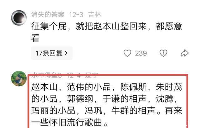 这就不得不提以前那些老少品演员了。 有东说念主说,搜集啥呀,就把赵本山整回来,王人忻悦看赵本山、宋丹丹、范伟、巩汉林、陈佩斯、朱时茂的小品,郭德纲、于谦、冯巩、牛群的相声。