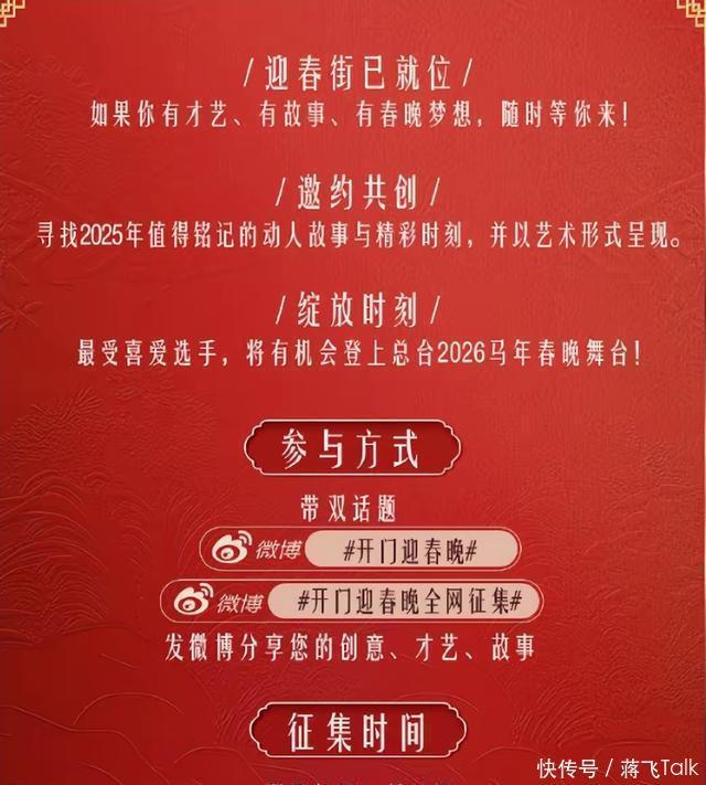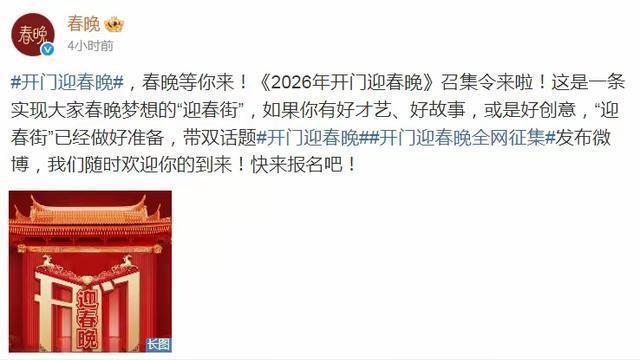 看《2026年开门迎春晚》召集令是这么: 若是你有才艺、有故事、有春晚梦思,随时等你来,邀约共创,寻找2025年值得牢记的动东说念主故事与精彩时代,并以艺术容颜呈现。 选出最受羡慕选手,将有契机登上总台2026马年春晚舞台。 参与形状是,微博带双话题,#开门迎春晚##开门迎春晚全网搜集#。搜集时候,到12月31日放胆。